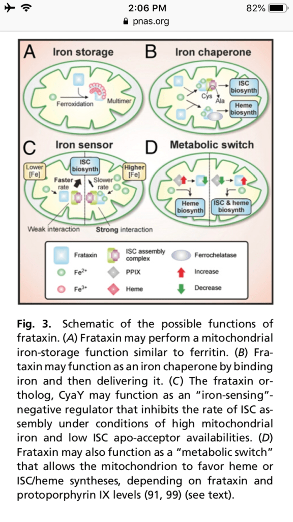 Frataxin has been proposed to function as a mitochondrial iron storage protein. Perhaps the most promising emerging role for frataxin is as an iron chaperone (Fig. 3B) for ISC and heme biosyntheses. Frataxin has been ob- served to interact with, and presumably donate iron to, iron-dependent proteins involved in ISC and heme biosyntheses.